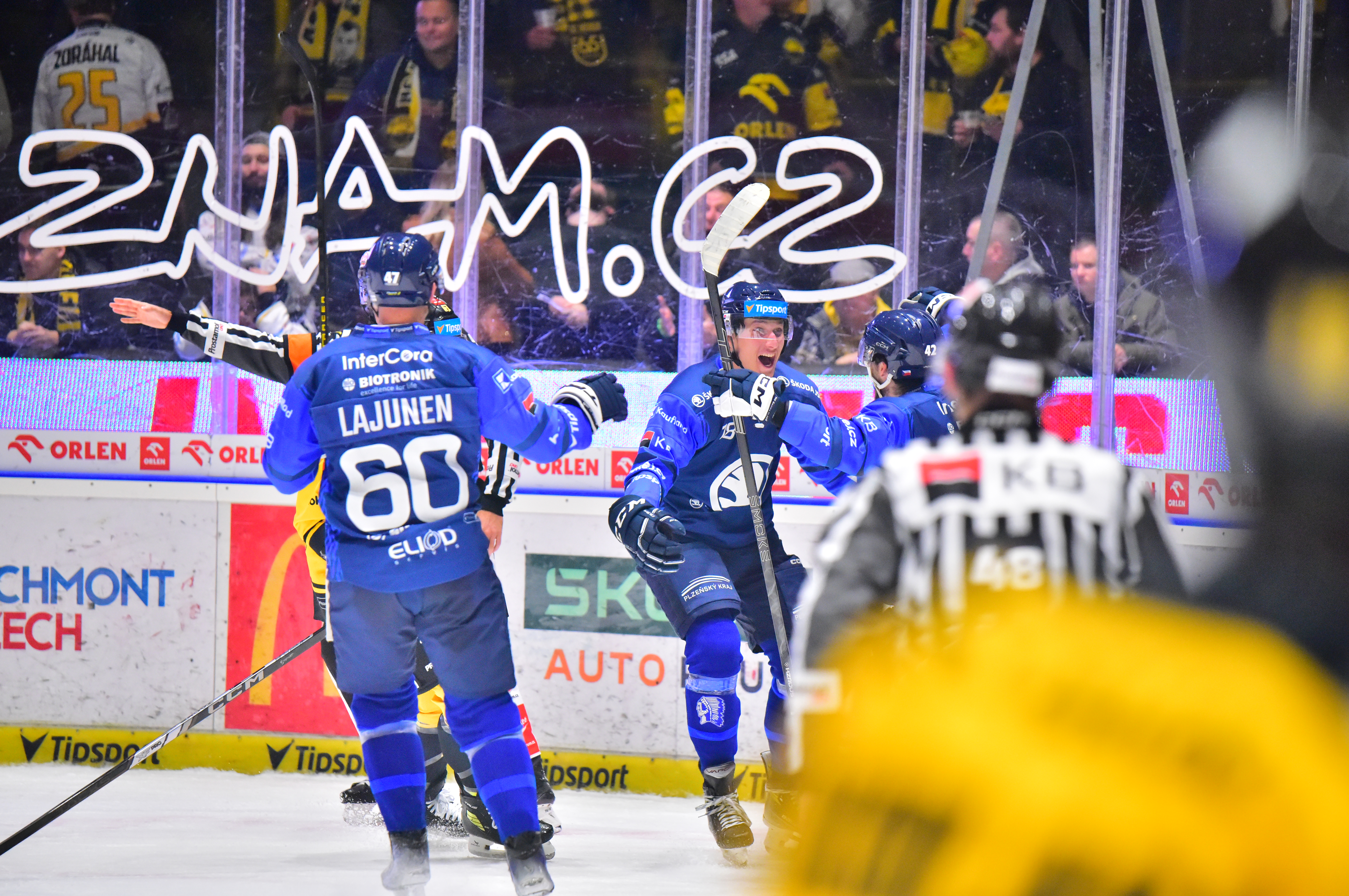 Plzeňská radost po rozhodnutí v utkání na ledě Litvínova v 60. minutě, foto: Matyáš Rjabi