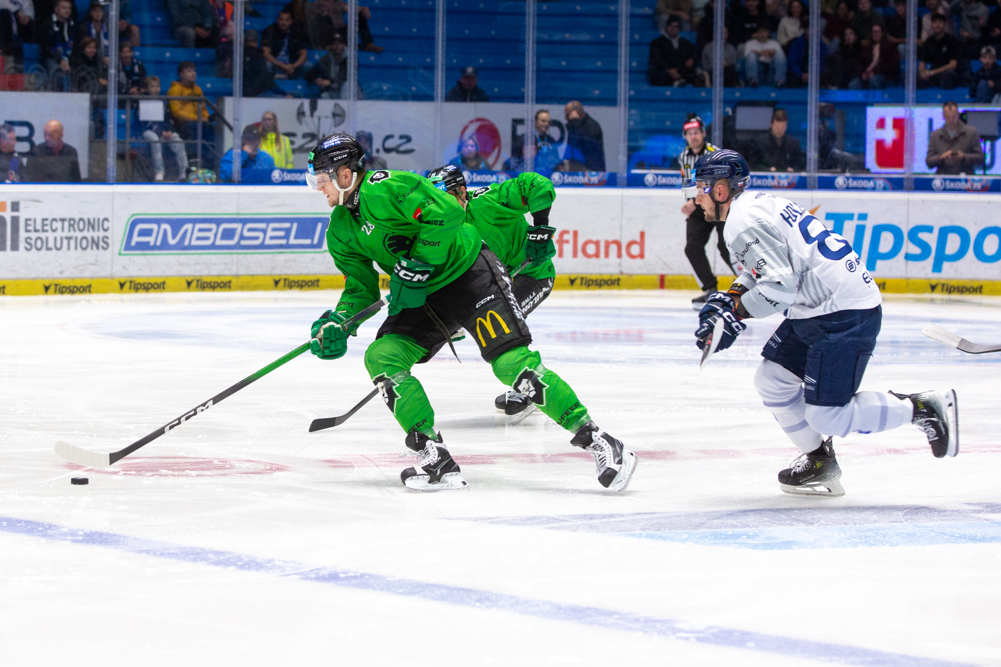 Bruslaři mohli ve středeční dohrávce na ledě Plzně počítat se všemi hráči, kteří nastoupili v pátek doma proti Českým Budějovicím. Oproti stávajícímu listu marodky stejně jako proti Jihočechům chyběl Tomáš Mazura, jinak ale zelenobílí hráli v podobném složení jako v posledních duelech. Mezi tři tyče se podesáté v sezoně postavil Dominik Furch.